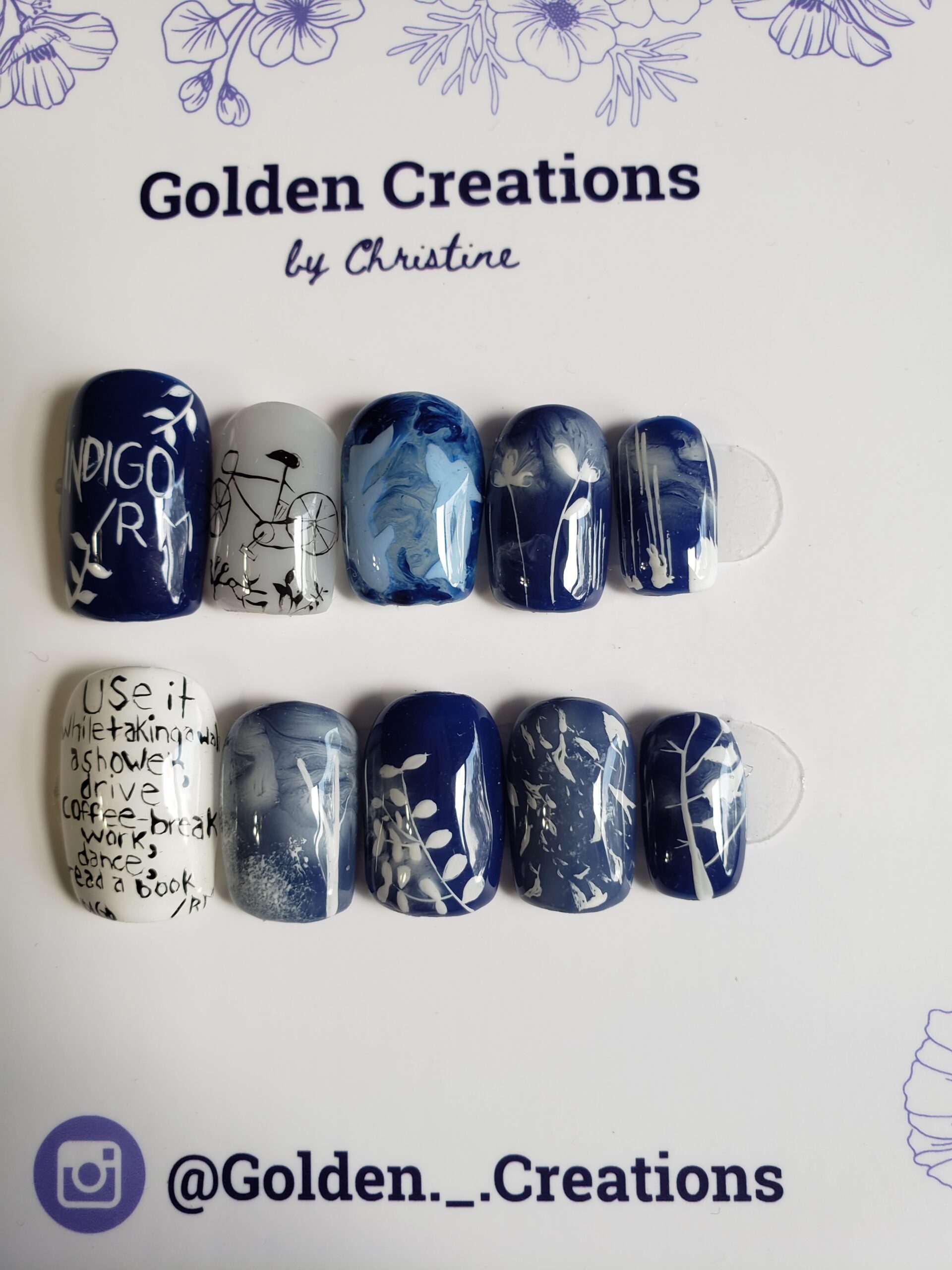Calm, creative, and effortlessly chic — this press-on set captures the beauty of quiet moments. With deep indigo blues, soft marbling, leafy silhouettes, and handwritten notes, Indigo Dreams feels like pages from a journal turned into wearable art.