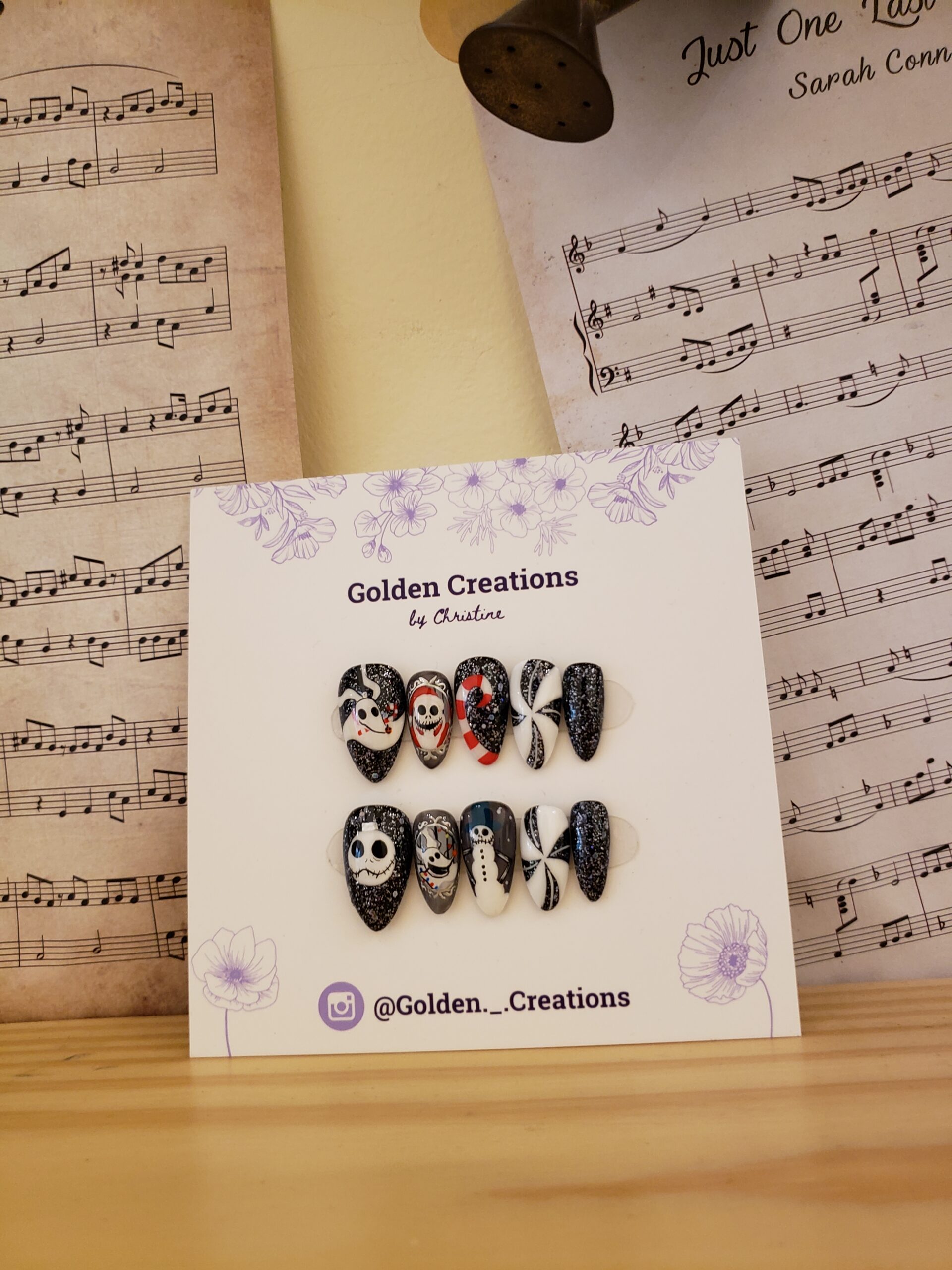 Step into a world where Halloween meets Christmas with our Jack Skellington Xmas Press-On Nails — a hauntingly chic twist for the holiday season. Inspired by The Nightmare Before Christmas, these nails feature black-and-white gothic art, snowy silver accents, and a touch of festive sparkle that perfectly captures Jack’s spooky charm.