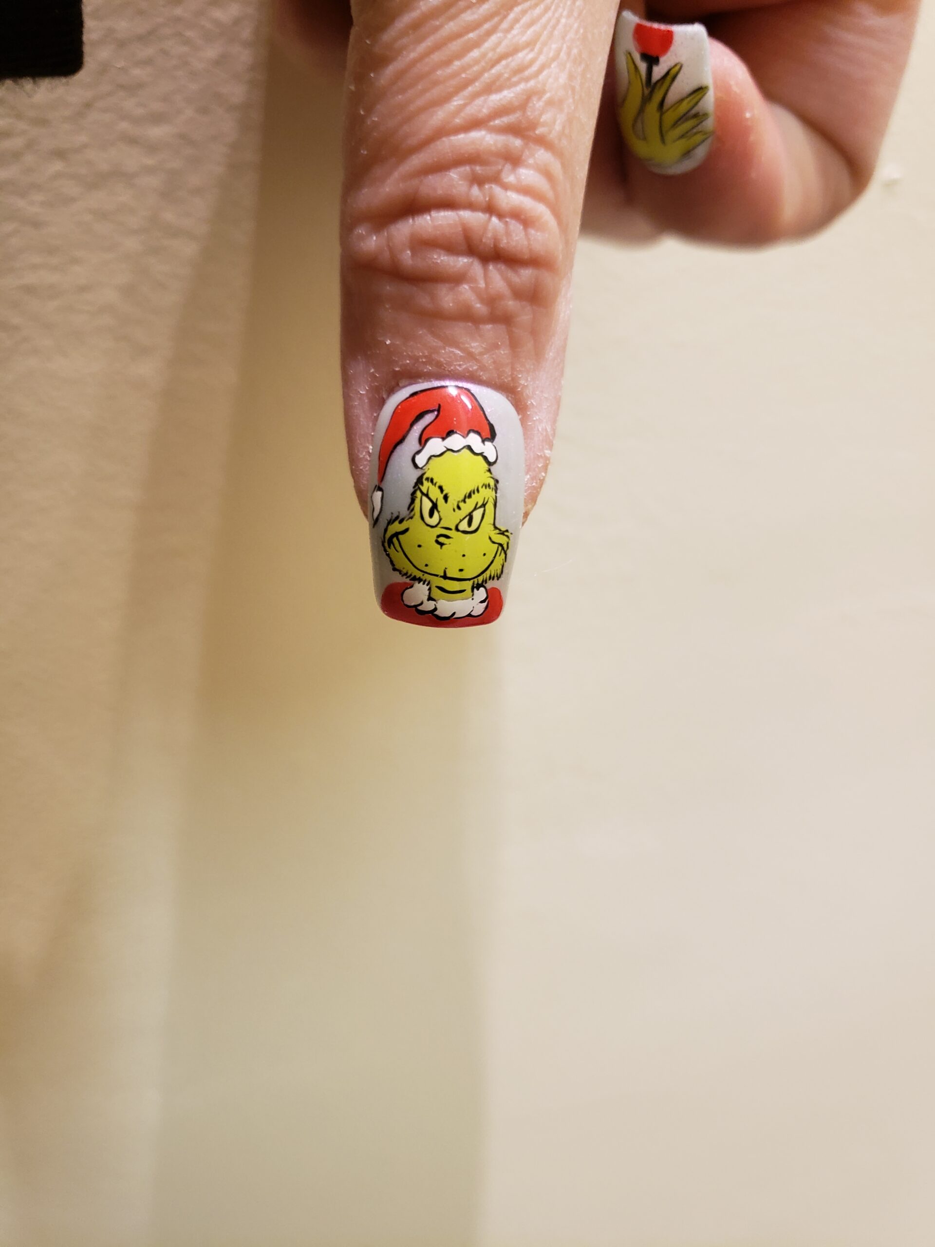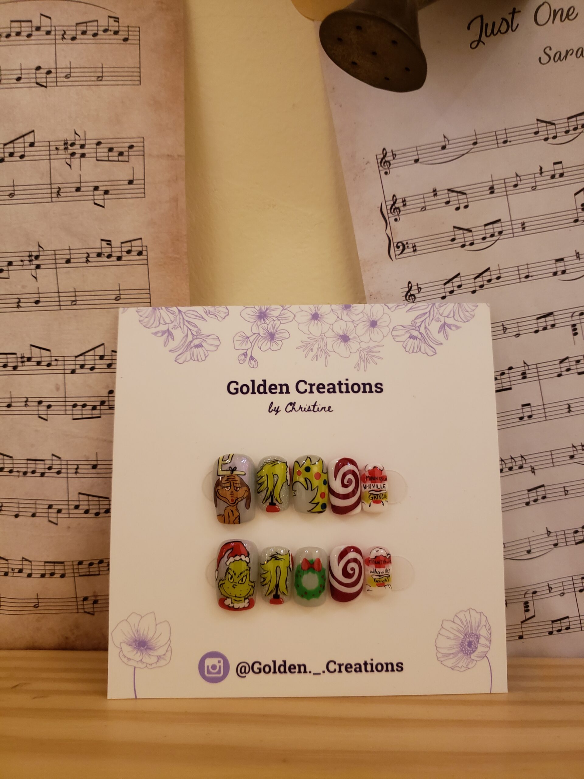 Steal the spotlight this holiday season with The Humbug Grinch Press-On Nails, inspired by everyone’s favorite mischievous Christmas spirit. These nails combine grinch-green hues, sparkling red accents, and frosty white details to give your fingertips that perfect festive sass.